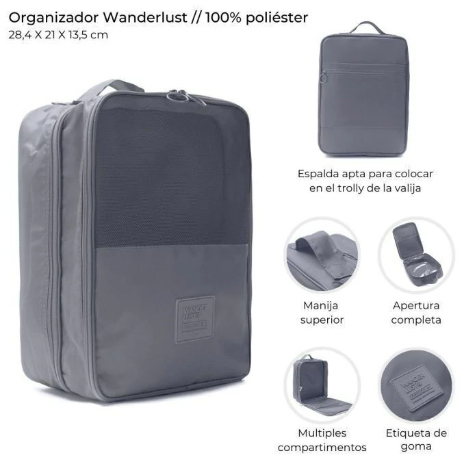 ¡Con el Organizador Wanderlust Gris tus cosas estarán más ordenadas que tus pensamientos en una reunión! Este práctico organizador, con medidas de 28,4 x 21 x 13,5 cm, cuenta con varios compartimentos y un cierre seguro, perfecto para llevar todo lo que necesitas.